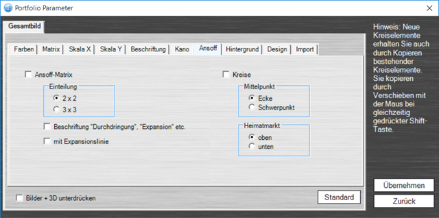 Wenn Sie eine Ansoff-Matrix erstellen möchten, setzen Sie in diesem Fenster einen Haken bei "Ansoff-Matrix". Hier können Sie auch weitere Parameter der Ansoff-Matrix einstellen. Weitere Informationen finden Sie im Video "Ansoff-Matrix"..