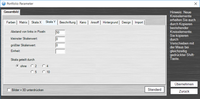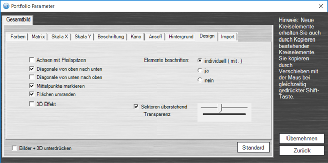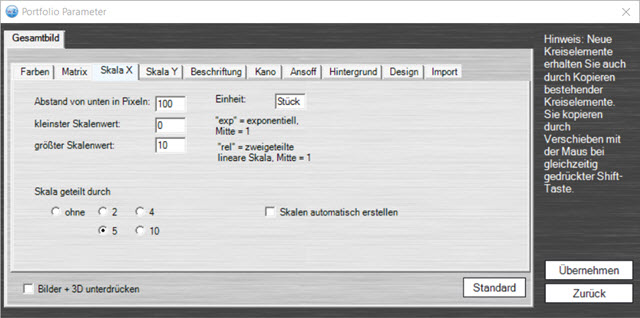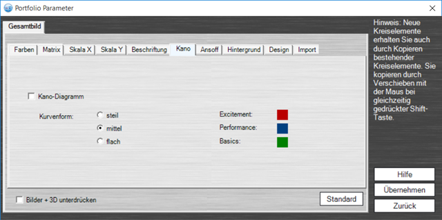 Um ein Kano-Diagramm zu erstellen, setzen Sie in diesem Fenster ein Häkchen bei "Kano-Diagramm" und wählen die Kurvenform (steil / mittel / flach) aus. Die Auswahl "Kano-Diagramm" wirkt sich u.a. auch auf das Beschriftungs-Fenster aus, so dass dort dann mehr Beschriftungsfelder genutzt werden können.