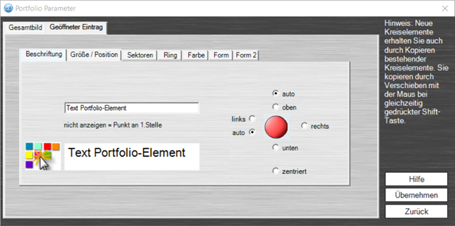 In diesem Parameterfenster können Sie die Beschriftung eines Portfolioelements ändern und die Anordnung des Schriftzuges festlegen. Auch die Farbe der Schrift kann angepasst werden.
