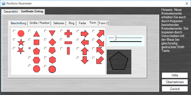 In diesem Fenster kann eine Form für das Portfolioelement ausgewählt werden. Mit dem Transparenzregler rechts lässt sich einstellen, wie stark der Hintergrund durch die Farbe des Elements durchscheint. So kann auch nur der Umriss angezeigt werden (Regler ganz nach links).