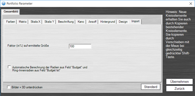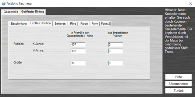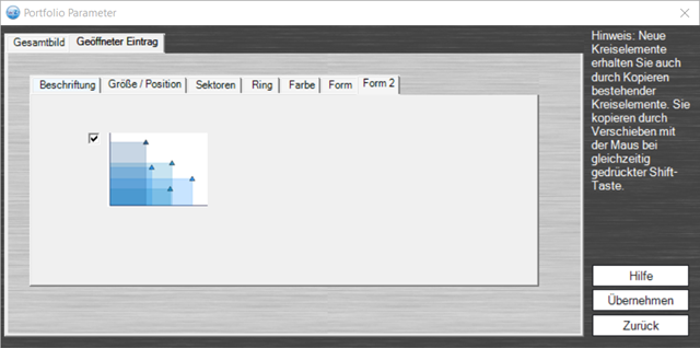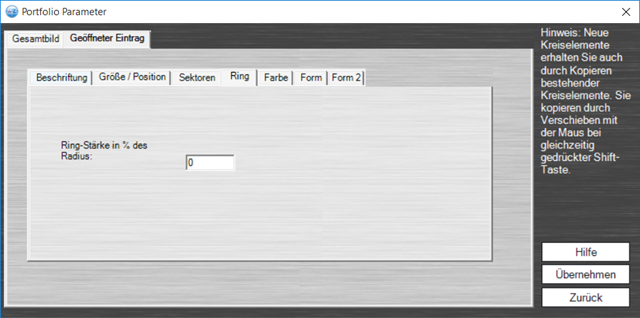 Bei der Darstellung der Portfolioelemente als Ringe (zur Verwendung bei überlappenden Flächen, z.B. bei Zeitverläufen), kann hier die Ring-Stärke in % des Elementradius angegeben werden. Sobald hier eine Angabe erfolgt, wird das Element als Ring dargestellt. Ringe gibt es selbstverständlich nur bei kreisförmigen Elementen.