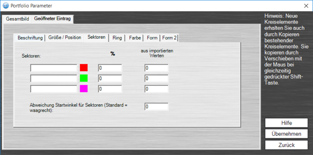 Hier können Sektorengröße, -farbe und -beschriftung festgelegt werden. Bei Bedarf kann auch eine Abweichung des Startwinkels für die Sektoren eingestellt werden (Standard ist waagrecht).