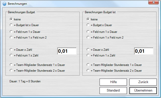 Unter Optionen > Projekt > Berechnungen stehen Ihnen einige Rechenfunktionen zur Verfügung. Die Ergebnisse werden im Budget- bzw im Budget Ist - Feld angezeigt (ggf. Spaltenaufbau anpassen).