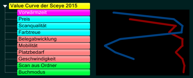 Eine Value Curve ist eigentlich kein Diagramm, sondern ein Verfahren. Man lotet damit Möglichkeiten für konkurrenzlose Produktnischen aus. Das Beispiel zeigt die Sceye-Dokumentenkamera als Innovation im Bereich Scannerprodukte.