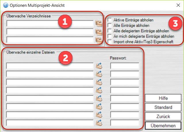 Die Multiprojektüberwachung setzt voraus, dass in einem Projekteverzeichnis oder dessen Unterverzeichnissen sich mZ-Dateien befinden (Dateiendung .xml) Dieses Projekteverzeichnis gibt man wie bei (1) in Optionen / Einstellungen / Multiprojekt-Überwachung an.