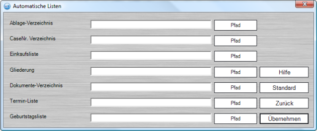 meineZIELE kann einige der angebotenen Listenausgaben zur beliebigen Verwendung und an eine beliebige Stelle automatisch ausgeben. In diesem Optionsfenster könnten Sie z.B. Pfade in den Cloud-Speicher Dropbox einstellen und haben stets z.B. eine aktuelle Einkaufsliste dabei. Beim Speichern von meineZIELE wird dann immer automatisch eine aktuelle Liste im txt-Format in Ihrer Dropbox gespeichert. So können Sie jederzeit unterwegs mit Ihrem Smartphone darauf zugreifen und haben stets eine aktuelle Einkaufsliste dabei. Verfügbare Listen: Siehe Screenshot.