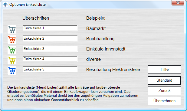 Hier in den Optionen zur Funktion "Einkaufsliste" können Sie