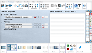 Rechts findet die zeitliche Planung statt. Hier stehen Ihre Termine. Sie können zwischen dem Tages-Kalenderblatt und zwei zielorientierten Ansichten wählen.
