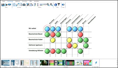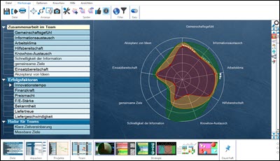 Nutzen Sie die Spider-Ansicht zur systematischen Arbeit an Ihren Erfolgsfaktoren. Oder nutzen Sie sie zur Team-Entwicklung z.B. mit der Radar-Methode nach Helmut Clemm ...
